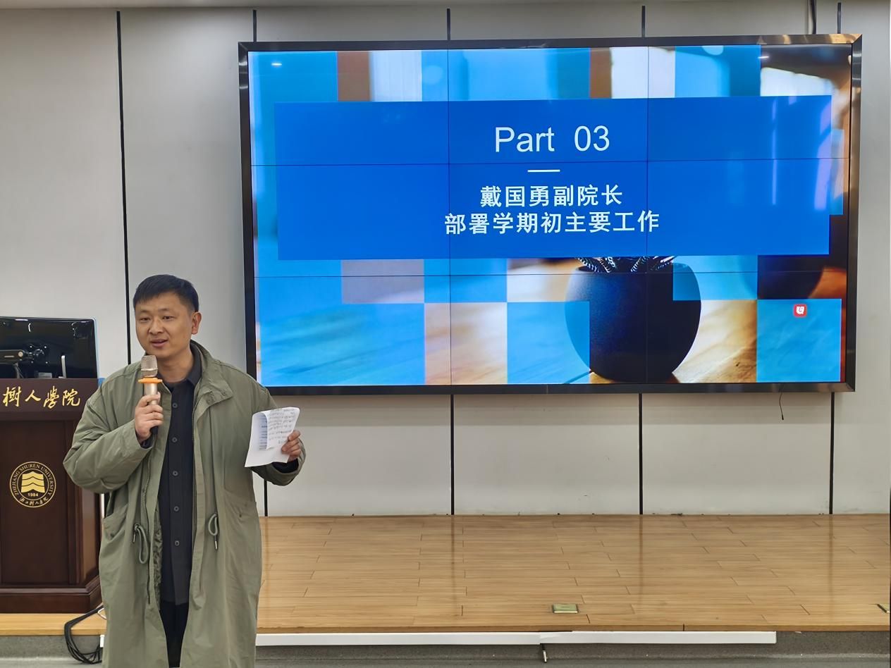 会上,各分管领导结合分管工作,细化部署新学期重点任务。党委副书记丁健龙分析了近5年学院教师在科研、教学、育人等方面的基础数据,明确了各类项目申报时间节点,要求全体教职工强化学生关爱,深耕育人一线,多进寝室、进课堂、开班会,精准掌握学生思想动态与学习生活情况;积极引导学生参与学科竞赛,以赛促学、以赛促练,全面提升学生综合素养。同时,他希望全体教职工提前谋划、协同发力,扎实推进2026年招生就业工作,着力提升招生质量与就业效率。副院长戴国勇就开学初期日常教学、教学规范落实、毕业设计指导等工作作出具体安排,要求全体教师强化责任意识,不断提升教学能力,加强对学生的引导与督促,严把教学质量关,确保各项教学工作有序推进。