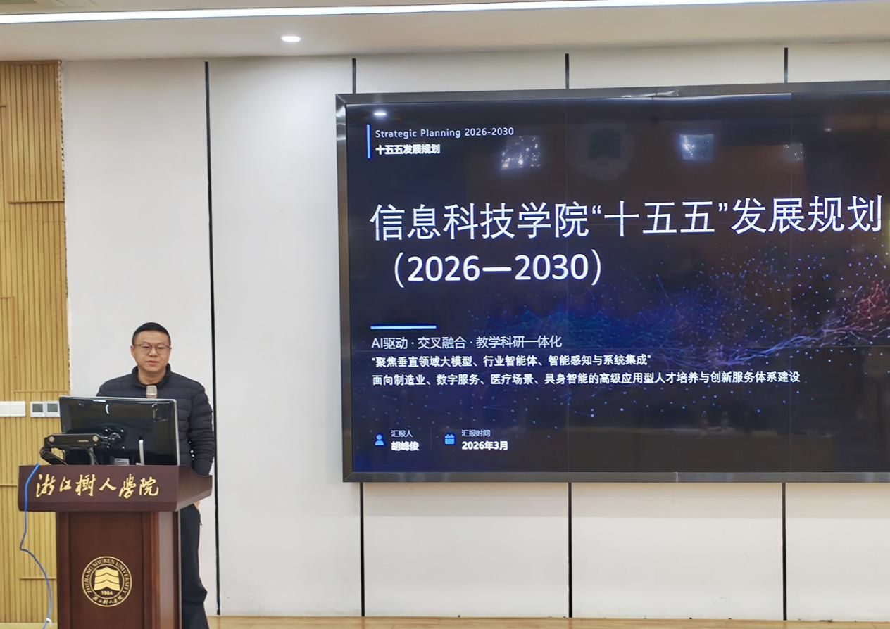 胡峰俊院长回顾了2025年学院各项工作取得的成效,全面展望了学院“十五五”发展规划。他表示,“十五五”期间,学院将立足高级应用型人才培养定位,紧扣浙江“315”科技创新体系与“415X”先进制造业集群发展需求,聚焦制造业、医疗、具身智能等重点应用场景,着力构建“AI底座+行业场景+工程实践+产教协同”的学科专业一体化体系,打造以垂直领域大模型与行业智能体应用为特色的发展路径,努力建成服务区域产业数字化升级的高水平应用型人才培养与创新服务高地。同时,他发动全院教职工以系为单位,积极建言献策,广泛征求学院绩效考核分配方案意见建议,进一步优化考核机制,为学校学院各项工作稳步推进贡献信息学院力量。